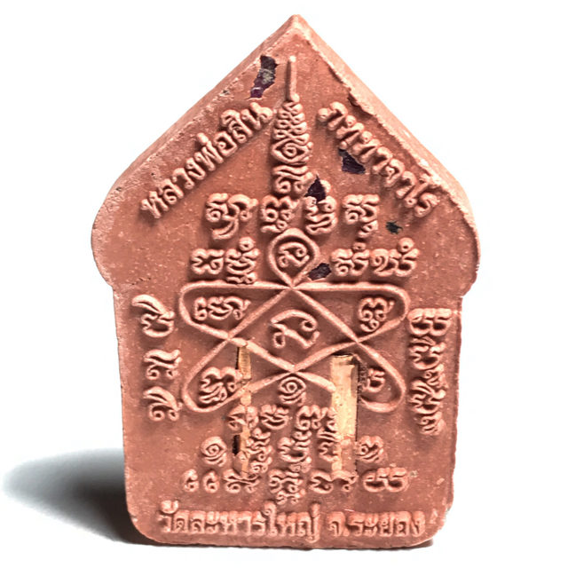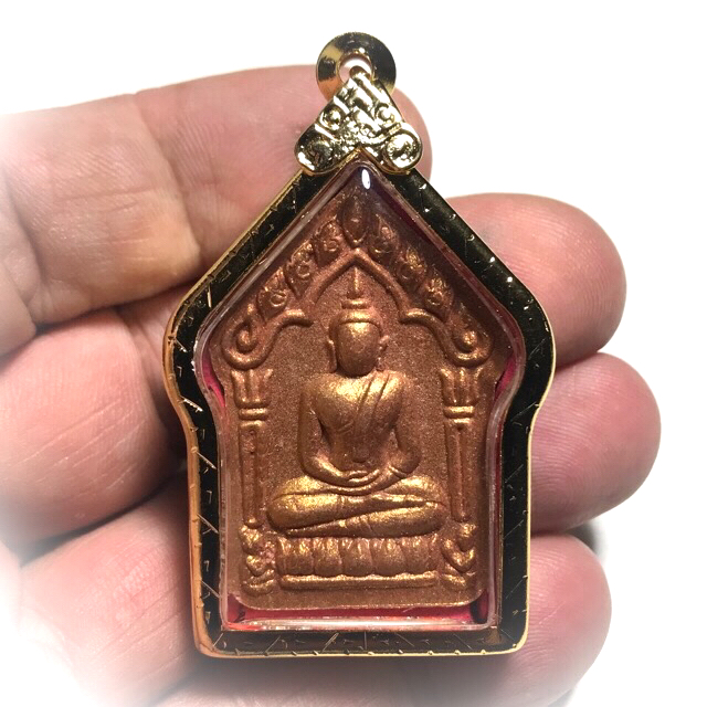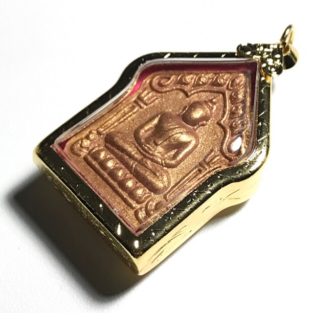 Pra Khun Phaen Sacred amulet from Luang Por Sin of Wat Lahan Yai, in Nuea Wan Sabu Luead Bloodsoap Herb Red Powders, mixed with Prai Kuman powders, with Bronze Coated front face, a Double Takrut Tong Daeng (Bronze/Copper), and Ploi Sek Gemstone fragments spinkled into the rear face. The amulet comes with brass casing included. The front face features the image of a Buddha seated in meditation posture and is a Pim Yai measuring 4 x 2.7 Cm Blessed in solo empowerment session after a 3 month Traimas period of empowerments, in the shrineroom of Wat Lahan Yai, by LP Sin.
