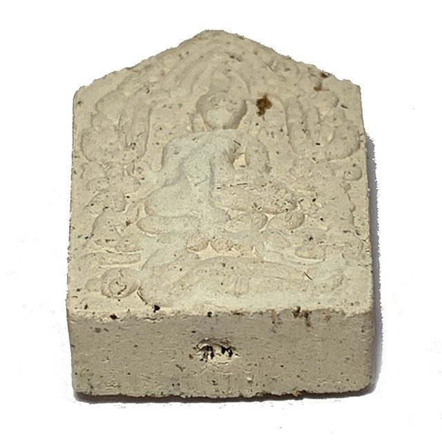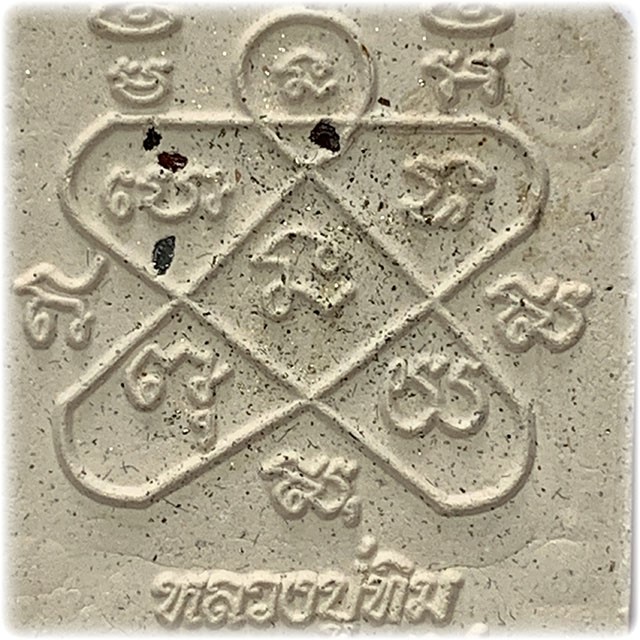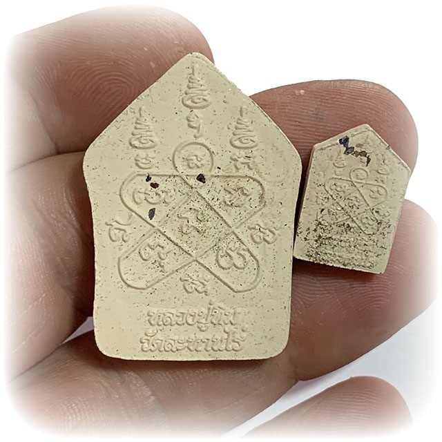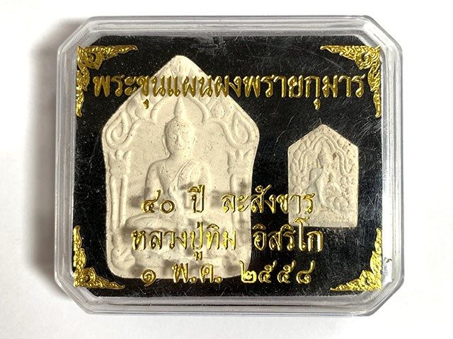 Special Gammagarn double set of Pim Yai (large) and Pim Lek (small) Khun Phaen Prai Kumarn amulets, in ‘Nam Reuks’ version (blessed with sacred talcs smeared on the amulets with the finger of the monk). Released in the Wat Laharn Rai 40 Years anniversary of Luang Phu Tim’s Passing edition, released in the ‘La Sangkharn 40’, 40th anniversary of Luang Phu Tim‘s passing ceremony in 2558 BE at Wat Laharn Rai. This Gammagarn set is in Nuea Khaw white Pong Prai Kumarn and Puttakun powders with Ploiu Sek Gemstone fragments and Pong Tabai metal filings from the casting of the Pra Kring and LP Tim statues sprinkled into thhe muan sarn. The Pim Yai has the code Na Agkhara Khom letter stamped onto the front face to mark this as a Special Gammagarn amulet released and blessed by hand in the ceremony.