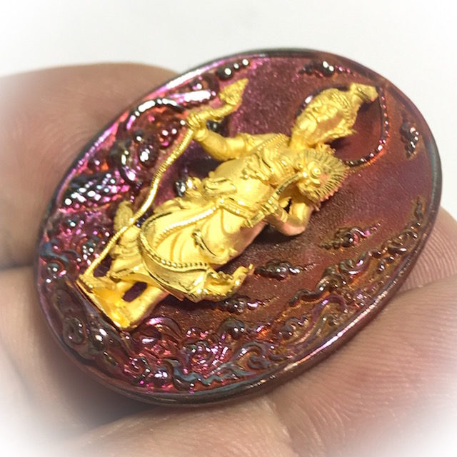 Rian Pu Lersi Dern Dong Ruesi Hermit God wandering in the Forest coin amulet in Nuea Chanuan Praw Rung Rainbow Flamed Alchemical Sacred Metallic Alloy with Gold Plated Brazen Image in 3D raised relief, from Luang Pu Bunthom Siribanyo, Blessed on the 27th of August by Luang Pu along with a number of other Great Geji Ajahn Masters.