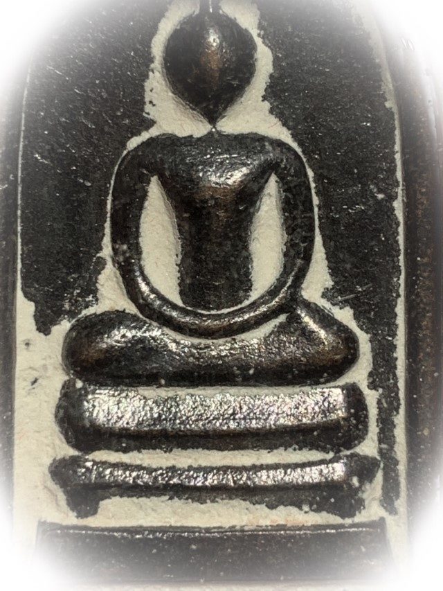 Pra Somdej Yok Thaana Lor Boran Alchemically Forged metallic votive tablet in Pim Gaes Talu Sum mode (topknot piercing the arch), with silver frame casing included. This Pim (Model version), being in Nuea Tong Daeng Kraap Bao, Sacred Blackened Copper artifact alloy and Yantra Ingot metals with Kraap Bao residue from Buddha statue making sprinkled on the surface.